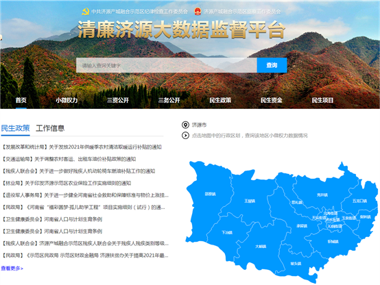 高标准谋划,搭建系统平台。济源示范区纪工委监察工委结合外地先进经验和济源本地实际,制定《“清廉济源”大数据监督平台建设实施方案》,成立“清廉济源”大数据监督平台建设工作领导小组及工作专班,明确平台建设目标、工作任务、实施范围、实施步骤及完成时限。高标准设计平台互联网主页和移动端页面,逐项细化平台模块内容,修改完善信息录入模板,完善程序功能设计,提高平台软件设计建设标准。