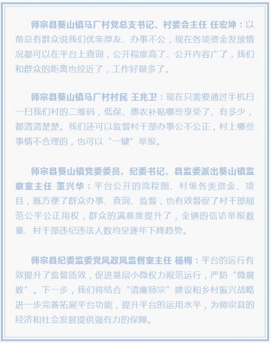 为加强对基层“小微权力”运行的监督制约,师宗县探索将大数据、云计算等技术手段与纪检监察工作深度融合,建设推行基层“小微权力”运行监督大数据平台,对“小微权力”实现全流程数字化监督,切实维护群众利益。